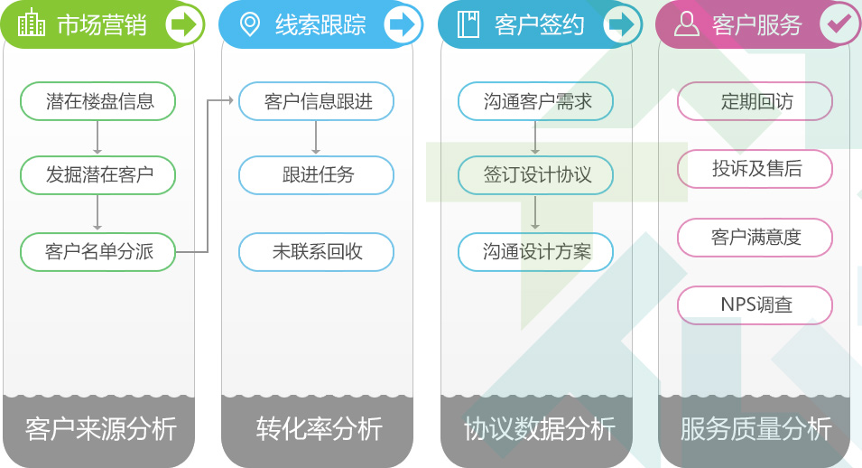 2、建立销售漏斗模型。将销售过程划分为不同阶段或环节,日常销售信息录入系统后,形成了直观的销售漏斗,科学反映销售机会状态升迁以及销售效率,预测销售结果;