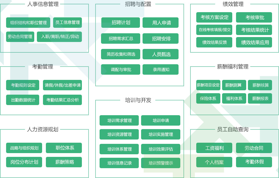 1、建立完整的组织架构体系及人员档案系统,员工入职、离职、调动时都可备案及查询。